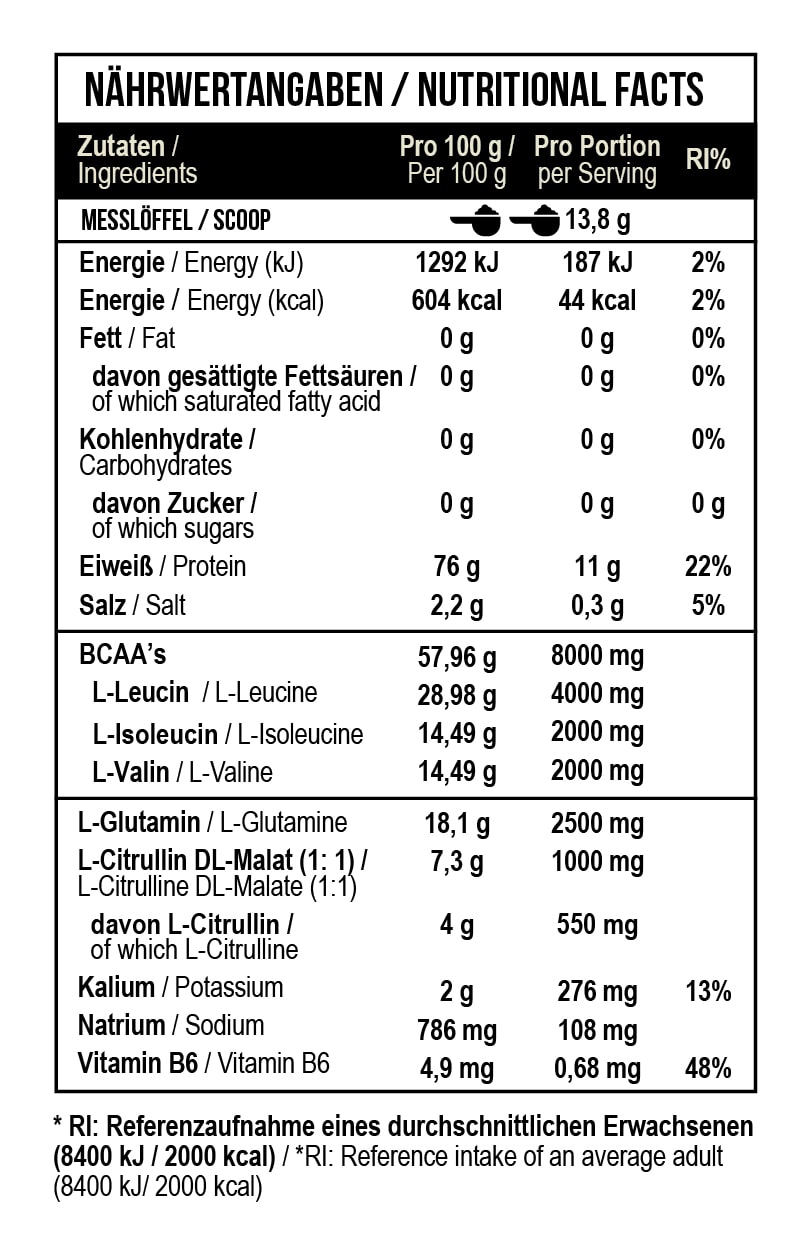 - Позитивно впливають приріст сухої м’язової маси, т.к. містять 8 г ВСАА в одній порції.