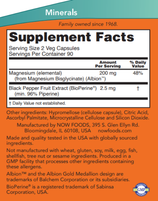 NOW Foods Magnesium Glycinate with BioPerine є високоякісною формою магнію з підвищеною біодоступністю, створеною для ефективної підтримки нервової системи, м'язів та загального самопочуття.